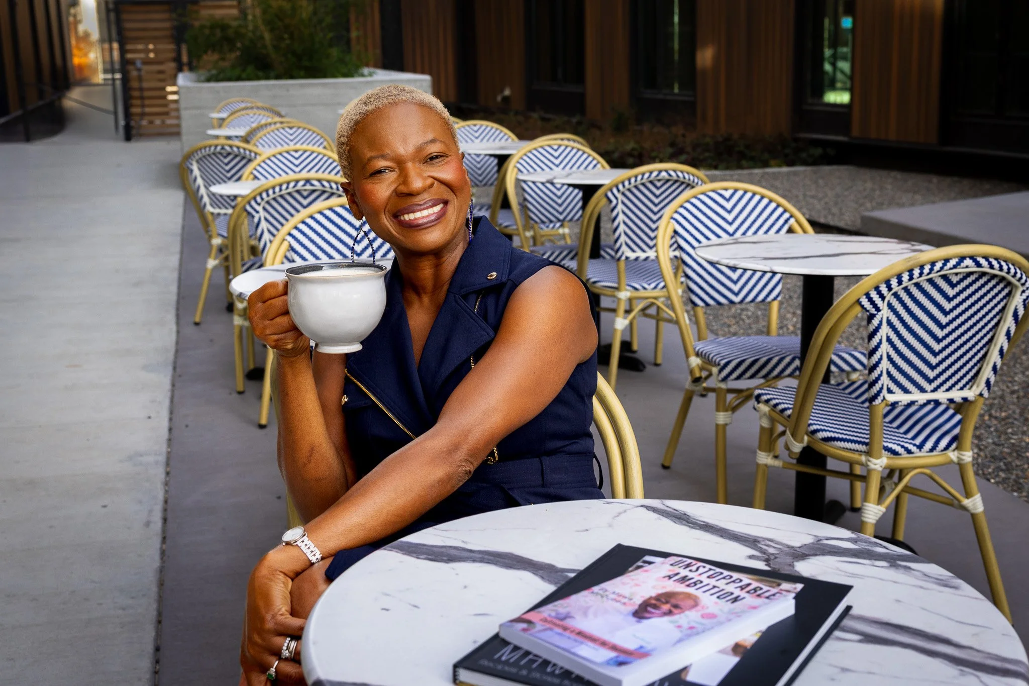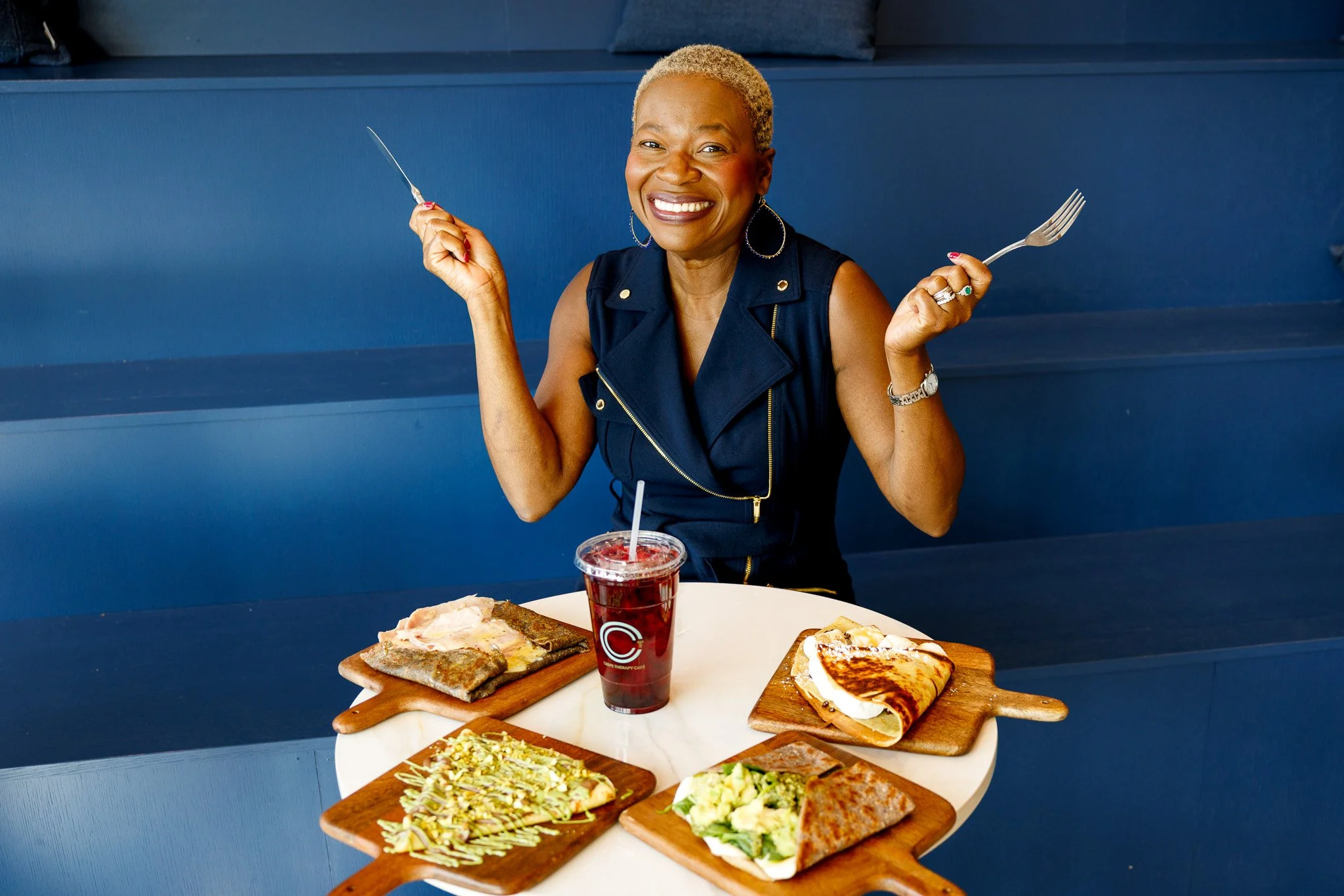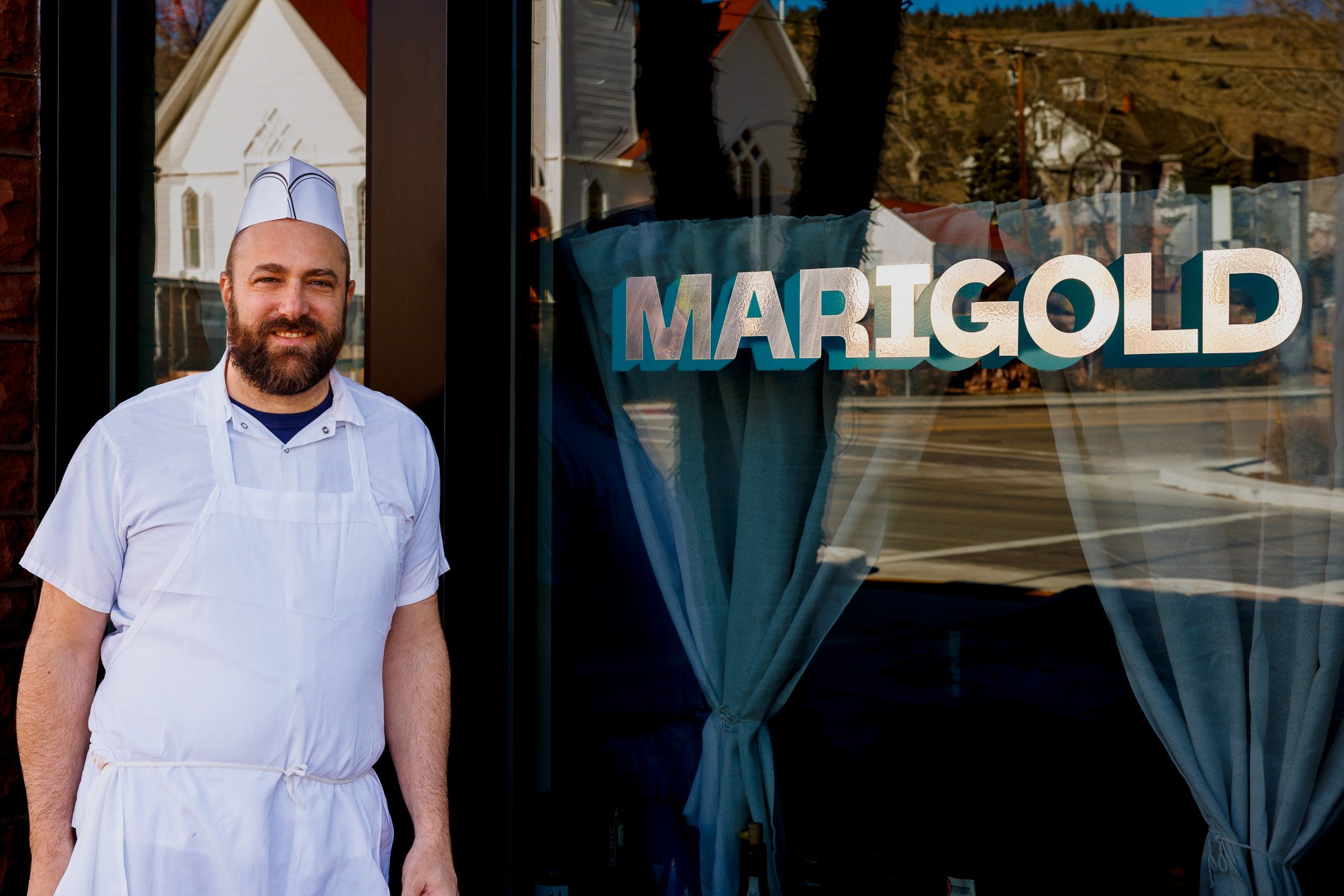A smiling man with a beard and dark hair wearing a black shirt and a brown apron, standing behind a marble countertop in a restaurant or café. There are small bowls and black rubber rings on the counter in front of him.